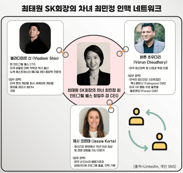 '최민정 사단'의 또 다른 핵심 인물로는 예일대 의학과 박사 출신인 정신의학 전문가 '바론 초우다리'(Varun Choudhary)와 임상 전문가인 '제시 코르테'(Jessie Korte) 등이 꼽히고 있다. 초우다리는 미국 정신의학 및 신경과 학회의 인증을 받은 정신의학 분야 전문가다. 과거 미국의 정신건강 스타트업인 '톡스페이스'(Talkspace), 가상현실(VR)을 활용한 미국의 행동 치료 플랫폼 '플로레오'(Floreo) 등에서 최고의료책임자(CMO)를 역임하기도 했다. 코르테는 정신건강 분야에서 15년 이상의 임상 및 경영 경험을 지닌 전문가로 미국 내 다수의 행동건강 기관과 비영리단체에서 프로그램 총괄, 전략 기획 등을 수행한 이력을 지녔다.