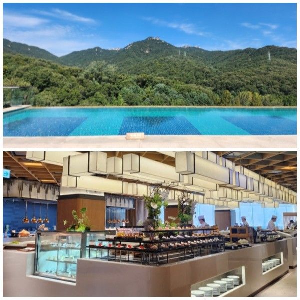 회원 전용 인피티니 풀(사진 위)와 우디플레이트 내부 전경. = 추민선 기자