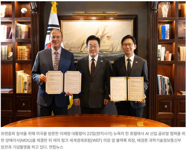 22일(현지시간) 뉴욕에서 열린 유엔총회 일정 중 이 대통령은 핑크 회장을 만나 AI·재생에너지 인프라 투자 관련 양해각서(MOU)를 체결했다. 정부는 이번 협약을 통해 한국을 아시아·태평양 지역의 인공지능 수도로 육성한다는 전략적 목표를 밝혔다. 자리에는 과학기술정보통신부 배경훈 장관도 동석해 협력의 무게감을 더했다.