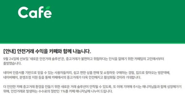 뉴시스 보도에 따르면, 24일 네이버에 따르면 이 회사는 이날 카페 내 개인 간 거래에 적용할 '안전거래' 솔루션을 도입했으며 카페 매니저를 대상으로 이러한 내용의 수익 분배 모델을 안내했다.