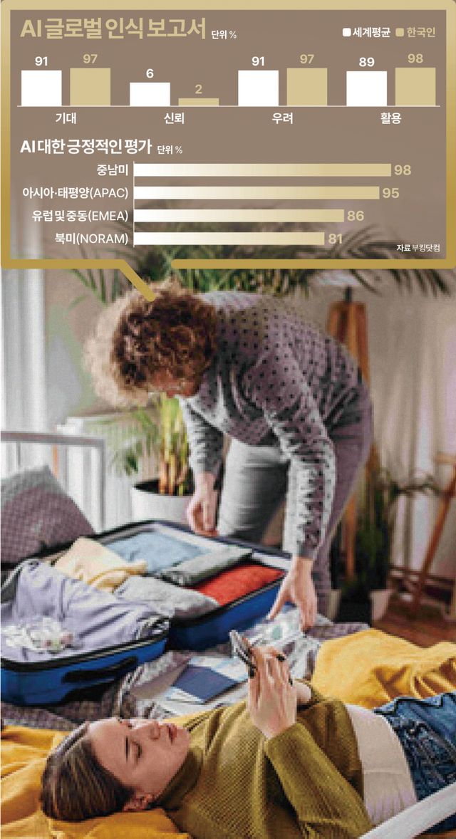 태도 역시 흥미롭다. 부킹닷컴의 AI 글로벌 인식 보고서에 따르면, 전 세계 응답자의 91%가 AI에 기대감을 느낀다고 답했지만, “AI를 완전히 신뢰한다”고 밝힌 비율은 6%에 불과했다. 응답자 중 10명 중 9명은 AI를 보조 도구로 여기되, 최종 결정은 스스로 확인하려는 태도를 보인 것이다.