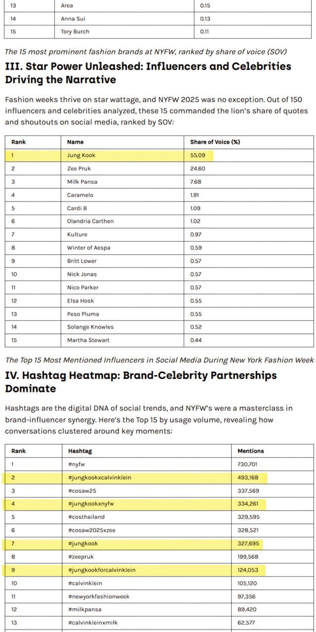 해시태그 순위에서도 정국은 패션위크를 장악했다. 전체 언급량 기준 1위는 #NYFW였지만, 그 뒤로 #jungkookxcalvinklein(2위), #jungkooknyfw(4위), #jungkook(7위), #jungkookforcalvinklein(9위) 등이 상위권을 휩쓸며 글로벌 팬덤의 뜨거운 반응을 증명했다.