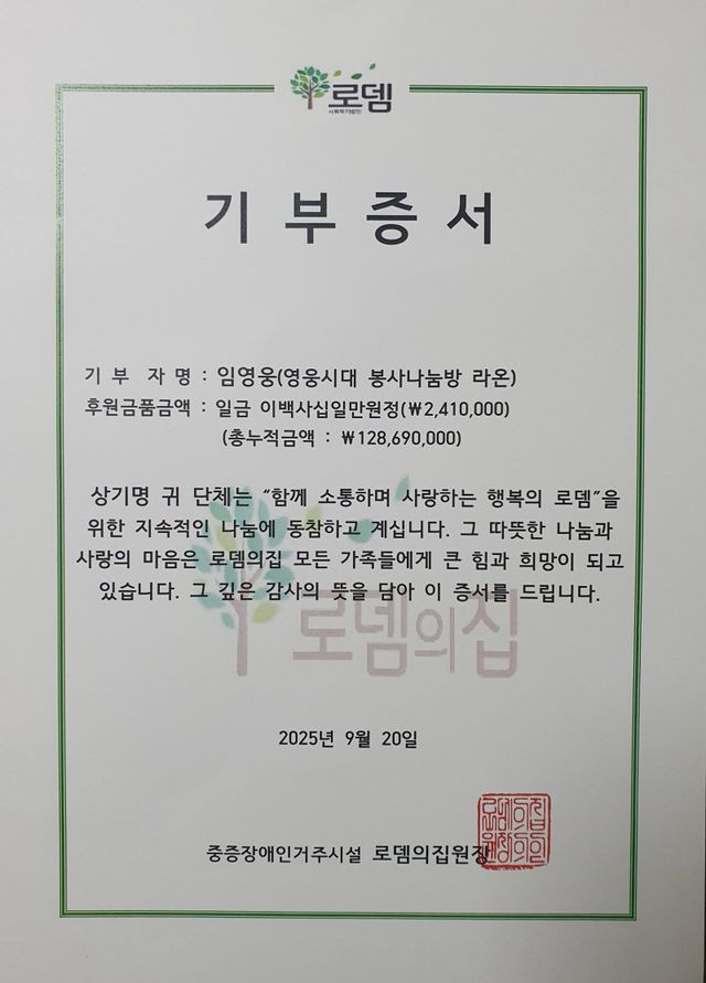 지난 52개월 동안 라온은 로뎀의집을 포함해 서울 쪽방촌, 용산 박스촌, 서울시아동복지협회, 희망을파는사람들, 서울대어린이병원 등에 급식 봉사와 후원금을 전달해왔으며, 누적 기부금은 1억8313만 원에 달한다.