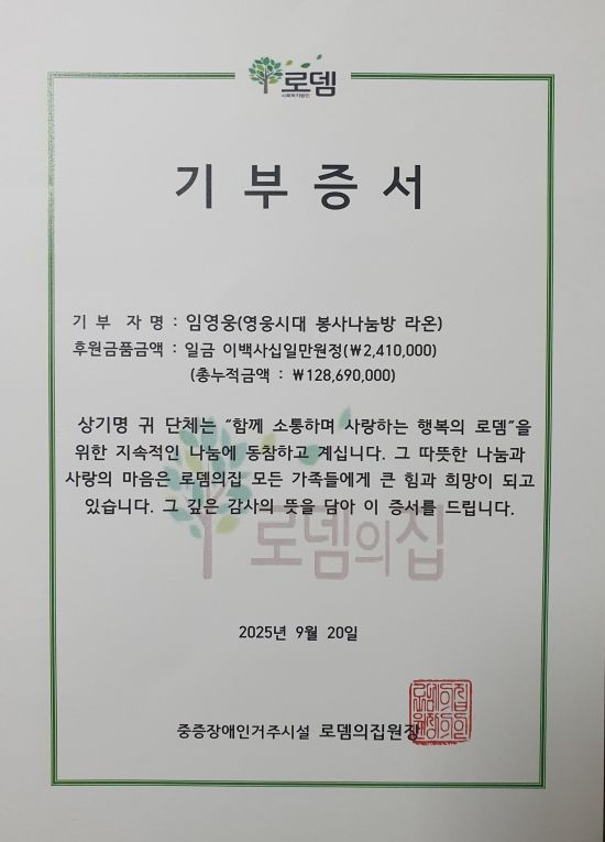 한편, '라온'은 로뎀의집을 비롯해 쪽방촌, 용산박스촌, 서울시아동복지협회, '희망을파는사람들', '서울대어린이병원' 등을 통해 매달 봉사활동과 후원을 이어왔다. 지난 52개월간 누적 후원금액은 1억 8,313만 원에 이른다.