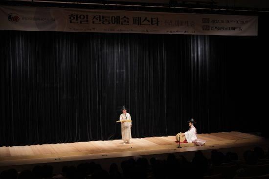 오후에는 ‘무대 위, 소리와 몸짓의 교류: 전주에서 만나는 한·일 전통예능의 정수’를 주제로 본격적인 공연이 펼쳐졌다. 일본 측에서는 나카무라 우메노가 무대에 올라 분장실을 재현한 세트 안에서 여성역이 만들어지는 과정을 시연했다. 관객들은 가부키 특유의 분장, 의상 착의, 가발 착용이 단계별로 완성되는 과정을 생생하게 지켜보았다. 이후 우메노는 완성된 모습으로 가부키 무용극 <등나무 아가씨(Fuji Musume)>를 선보였다. 암전 상태에서 조명 아래 떠오른 등나무 정령의 모습은 관객들의 탄성을 자아냈고, 의상이 단번에 바뀌는 ‘히키누키(引き抜き)’ 장면에서는 우레와 같은 박수가 터져 나왔다.