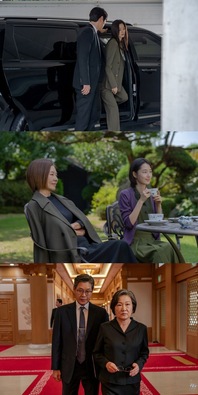 공개된 스틸은 위태로운 한반도를 둘러싸고 벌어지는 한 치 앞을 예상할 수 없는 전개를 담아내 이목을 집중시킨다. 모든 것을 걸고 전쟁의 위험을 폭로한 뒤, 아무도 모르는 곳으로 피신한 문주와 산호는 내일이 없을지도 모른다는 불안함 속에서 둘만의 시간을 보내며 잠시나마 소란스러운 세상을 뒤로한다. 특히, “두려웠어요, 당신이 다칠까 봐. 그래서 꿈에서도 당신을 붙들고 있었어요” 라며 문주를 향한 자신의 마음을 고백하는 산호의 애틋한 대사는 수많은 이들의 가슴을 두근거리게 하며 멜로 장르의 재미를 한껏 끌어올릴 것으로 기대를 모은다. 그러나 거대한 세력들의 이권 다툼 속 성가신 존재로 떠오른 문주는 제거의 타겟이 되고, 대한민국 대통령 경신(김해숙)에게 걸려 온 한 통의 전화는 “서문주, 그 여자를 처리해 주세요” 라며 불길한 긴장감을 더한다. 이러한 가운데, 누군가의 작전에 휘말린 문주와 산호는 스캔들에 휩싸이고, 홀로 생각에 잠긴 듯한 문주의 모습은 두 사람의 관계가 또 한 번 위기를 맞게 될 것을 예고한다. 여기에 더해 “그 여자를 사랑에 빠지게 하는 것도 계획이었나?” 라는 산호를 향한 운학(유재명)의 의미심장한 질문은 반전에 반전을 거듭하는 스토리가 과연 어디까지 치닫을지 흥미를 높인다. 한편, 옥선(이미숙)과 함께 평화로운 티타임을 즐기고 있는 한나(원지안)의 모습은 엄청난 비밀을 손에 쥔 그가 과연 어떤 계획을 꾸미고 있는 것일지 궁금증을 증폭시킨다. 전쟁의 위기가 드리운 국제 정세 속에서 해법을 찾는 듯 비장한 표정의 경신과 운학의 모습은 끊임없이 이어지는 거대한 사건들이 어디로 향할지 호기심을 자극한다.