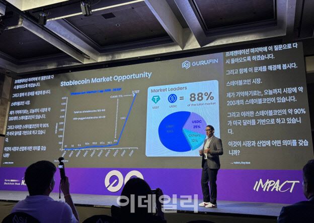 KBW에서 그루핀의 글로벌 전략 이사인 하이너 카마초(Heiner Camacho)는 ‘규제는 각국의 법률에 맞게, 교환은 글로벌하게’라는 주제발표를 통해 “현재 180~190개에 이르는 스테이블코인 중 90%이상이 미 달러 기반인 점과 실시간 준비금 공개가 이뤄지지 않는 등 투명성(Transparency) 문제와 불완전한 담보율로 인한 디페깅(Risk) 위험에 노출되어 있다”고 지적하며, 이를 해결할 새로운 표준으로 ‘GX 체인’ 모델을 소개했다.