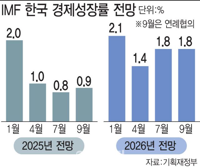 IMF 미션단은 올해 둔화한 한국 경제가 내년엔 반등할 것으로 내다봤다. 올해 성장률은 지난 7월 수정전망에서 제시한 0.8%보다 0.1%포인트 상향했고, 내년 성장률은 1.8%로 기존 전망을 유지했다. 이는 앞서 한국 정부가 발표한 성장률 전망치와 같은 수치지만, 경제협력개발기구(OECD)가 전날 내놓은 전망치(올해 1.0%·내년 2.2%)보다는 낮은 수준이다. IMF는 지난 4월 1.0%로 전망했다가, 7월 국내 정치와 글로벌 통상 불확실성 등을 반영해 0.8%로 0.2% 포인트 하향 조정했다.