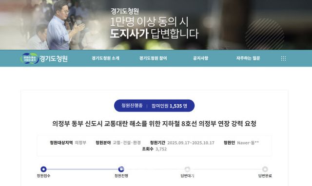 포털사이트 네이버 아이디의 청원인은 글을 통해 의정부 등 경기북부의 심각한 교통난 해소를 위해 지하철 8호선 의정부 연장 필요성을 제기했다.