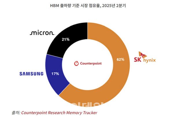 24일 카운터포인트리서치 최신 메모리 반도체 트래커에 따르면 올해 2분기 HBM 출하량 점유율 기준 1위는 SK하이닉스로 집계됐다. 마이크론이 21%로 2위, 삼성전자(005930)는 17%로 3위를 기록했다.