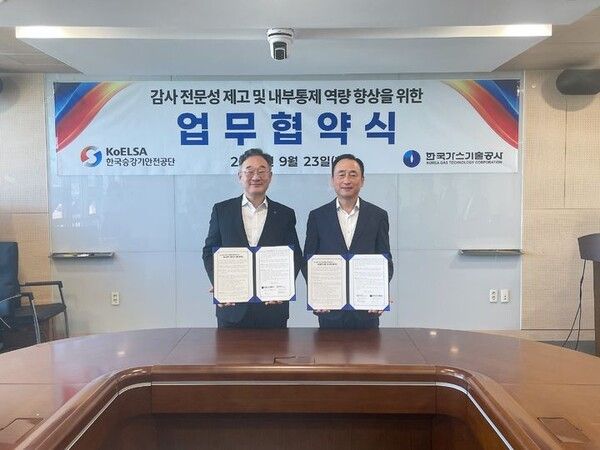 한국가스기술공사는 전날(23일) 한국승강기안전공단 본사에서 한국승강기안전공단과 안전분야 감사활동 역량 강화를 위한 감사 업무 협약식을 개최했다고 24일 밝혔다.