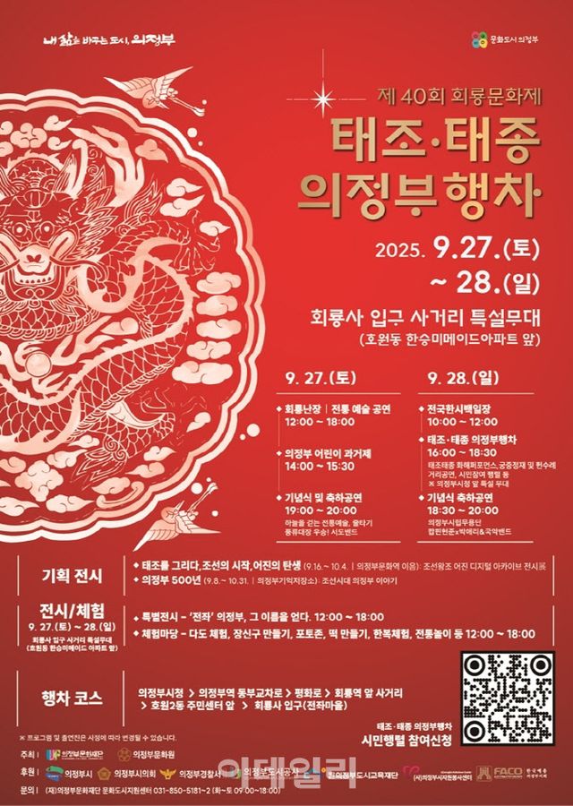 김동근 시장은 “620년 만에 재현되는 태조·태종의 의정부행차는 의정부의 정체성과 자긍심을 되살리는 역사적 장면이 될 것”이라며 “올해 회룡문화제가 시민 모두가 함께 만드는 문화 축제가 되고 의정부가 군사도시 이미지를 넘어 문화도시로 도약하는 계기가 되길 바란다”고 말했다.