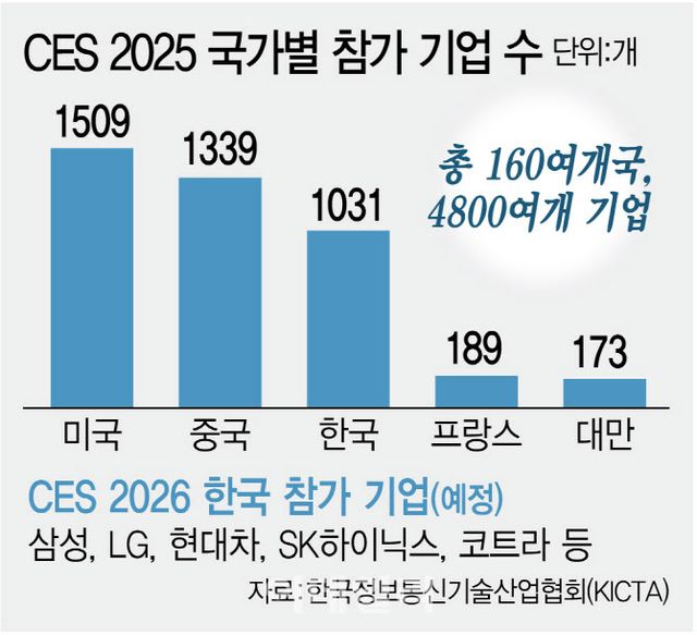 내년 1월 6~9일(현지시간) 미국 라스베이거스에서 열리는 CES 2026은 160여개 국가가 참가하는 세계적인 전시회다. 한국은 CES 2025에서 1031개 기업이 참가하며 미국(1509개), 중국(1339개)에 이어 세 번째로 높은 참가율을 보이고 있다. 올해도 삼성, SK, 현대차, LG 등 주요 기업들이 대거 행사를 준비하고 있다. 다만 올해는 이번 미국 구금 사태로 불확실성이 한층 커진 상황이다.
