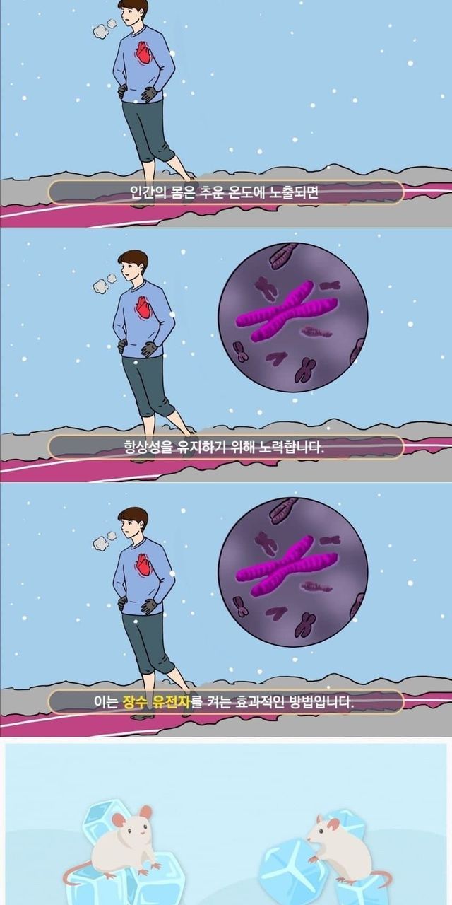 저 생쥐의 메커니즘은 모르겠습니다만 싱클레어박사가 몸을 추위에 노출하라는 것은 몸이 적당한 스트레스에 노출되면 우리몸에서 노화세포를 제거하고 변형된 유전자를 수리하는 유전자가 발현되서 그렇다고 설명합니다