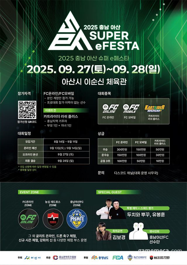 아산시가 주최하고, 충남콘텐츠진흥원이 주관하며, 충청남도와 FCA, 충남아산프로축구단, 농심 이스포츠 아카데미가 후원하는 충남 아산 슈퍼 e페스타가 27일과 28일 아산시 이순신 체육관에서 열린다.
