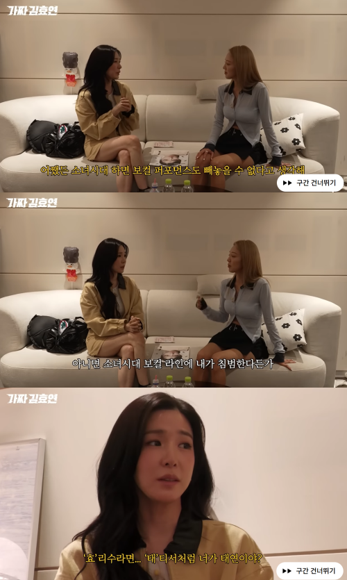 그러면서 "보컬 라인에 내가 침범하면 좀 위기의식을 느낄 것 같냐"고 물었고, 티파니는 "침범이라는 단어를 왜 쓰는 거냐"며 참고 있던 웃음을 터뜨렸다.