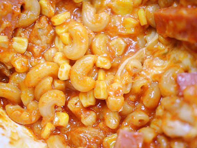 재료는 마카로니, 어묵, 다진마늘, 대파, 햄, 캔옥수수,