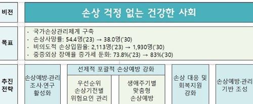 종합계획은 ‘손상 걱정 없는 건강한 사회’라는 비전 아래 손상사망률을 현재 54.4명(2023년)에서 38명(2030년)으로, 비의도적 손상입원율을 2,113명에서 1,930명으로 줄이는 것을 목표로 설정했다.