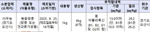 식품의약품안전처(처장 오유경)는 식품소분업체인 ‘(주)우농(경기도 오산시 소재)’이 소분·판매한 ‘볶음땅콩(식품유형 : 땅콩 또는 견과류가공품)’에서 아플라톡신이 기준치보다 초과 검출되어 해당 제품을 판매 중단하고 회수 조치한다고 밝혔다.