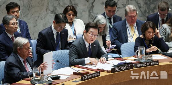 이재명 대통령이 24일(현지시간) 한국 정상으로는 처음으로 미국 뉴욕 유엔본부에서 열린 안전보장이사회(안보리) 공개 토의를 주재했다. 이 대통령은 이날 '인공지능(AI)과 국제 평화·안보'를 주제로 열린 토의에서 '모두를 위한 AI'를 기치로 내걸고 국제 사회의 책임 있는 이용을 당부했다.