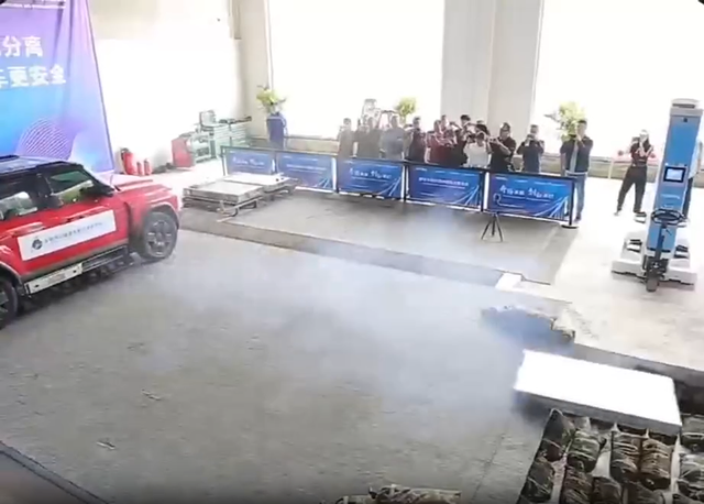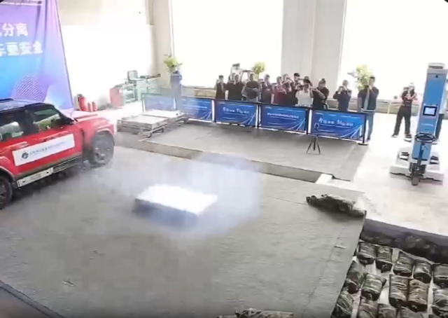 최근 SNS에서 확산된 영상을 살펴보면 SUV 측면에서 거대한 배터리 모듈이 튀어나와 수 미터 먼 곳에 떨어지고, 곧이어 연기가 피어오르는 장면이 담겼다. 안전 요원들이 곧바로 특수 담요를 덮어 진화에 나섰고, 착지 지점에는 완충 장치가 미리 설치돼 있다.