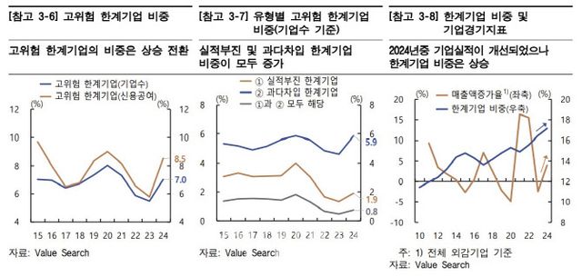 부실 가능성이 큰 고위험 한계기업의 비중 역시 상승했다. 한계기업 중에서도 수익 또는 재무구조 측면에서 위험성이 높은 기업을 판별해 전체 기업에서 차지하는 비중을 살펴본 결과, 기업수(2023년 5.5%→ 2024년 7%) 및 신용공여(5.8%→ 8.5%) 기준에서 모두 지난해에 상승 전환했다. 유형별로 살펴보면 실적부진 한계기업(수익 측면 고위험) 및 과다차입 한계기업(재무구조 측면 고위험)의 비중이 모두 늘어난 가운데 과다차입 한계기업 비중이 크게 높아진 것으로 나타났다.