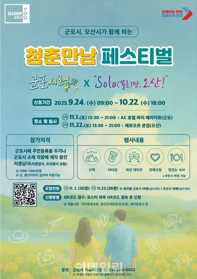 25일 경기 군포시에 따르면 오는 11월 1일과 22일 두 차례에 걸쳐 청년 미혼남녀를 위한 만남 행사를 오산시와 함께 개최한다.