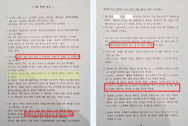 노 관장 측 인사가 작성했다는 SK 관련 내부 보고서에는 문재인 전 대통령과 최태원 회장 간의 밀접한 관계가 있다고 적혀있다. 해당 문건에는 SK그룹의 경영 상황과 정치권과의 연결고리가 상세히 기록돼있으며, 일부 내용은 검찰 수사와도 연관성을 제기하고 있다.
