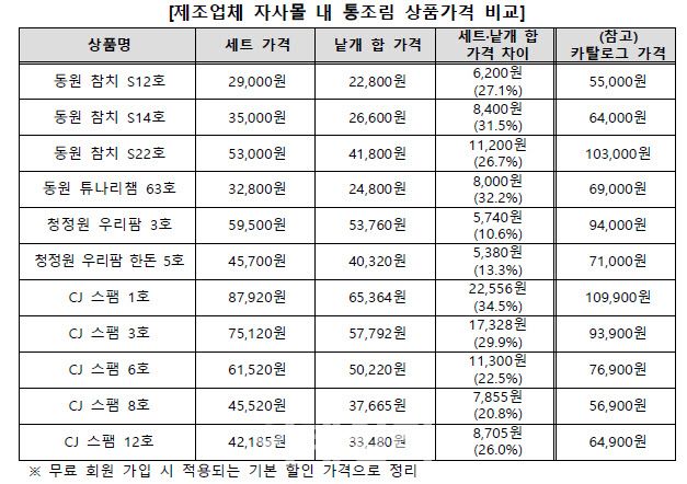 제조업체 자사몰에서 판매하는 선물 세트 중 낱개로 구매가 가능한 43종 상품 가격을 조사한 결과 83.7%(36종)는 낱개일 때보다 세트일 때 가격이 더 비쌌다. 16.3%(7종)는 세트로 구매하는 것이 더 저렴했다.