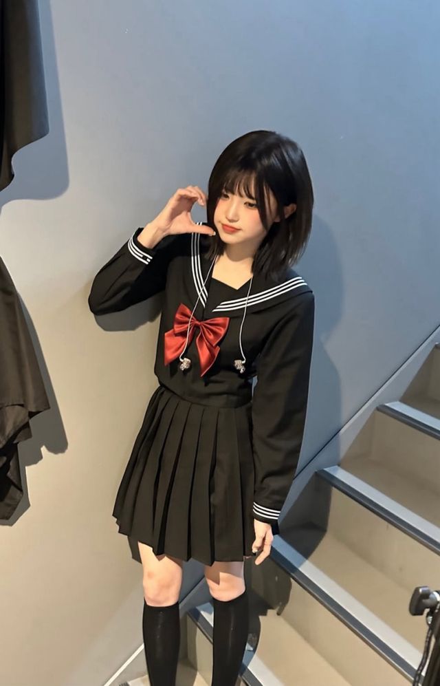 공개된 사진 속 그는 블랙 세일러 교복 스타일의 의상에 레드 리본 포인트를 매치해 청순하면서도 단아한 매력을 뽐냈다. 단발 헤어와 자연스러운 표정이 어우러져 소녀 같은 분위기를 자아냈고, 손가락으로 하트를 그리며 사랑스러운 포즈까지 선보였다.