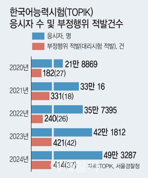 응시자 수는 최근 5년 새 급격히 증가했다. 지난 2020년 21만 8869명 수준이었던 토픽 응시자는 △2021년 33만 16명 △2022년 35만 7395명 △2023년 42만 1812명으로 빠르게 늘어났고 지난해엔 49만 3287명에 달했다. 5년 만에 두 배 이상 늘어난 것이다.