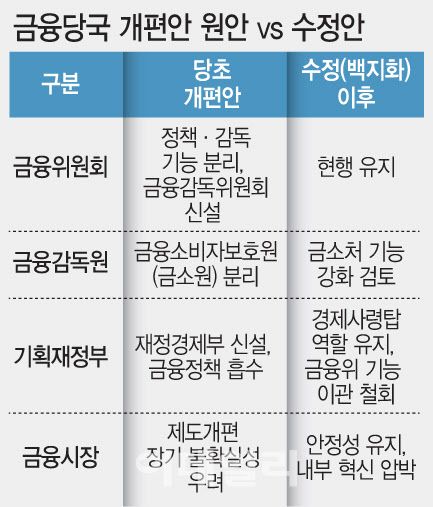민주당 관계자는 “정부와 국회가 이번에 한발 물러선 건 금융시장 불안정을 막기 위한 불가피한 선택이다”며 “금감원이 뚜렷한 성과를 내지 못한다면 조직개편 논의는 언제든 다시 논의 테이블에 오를 수 있다”고 말했다.