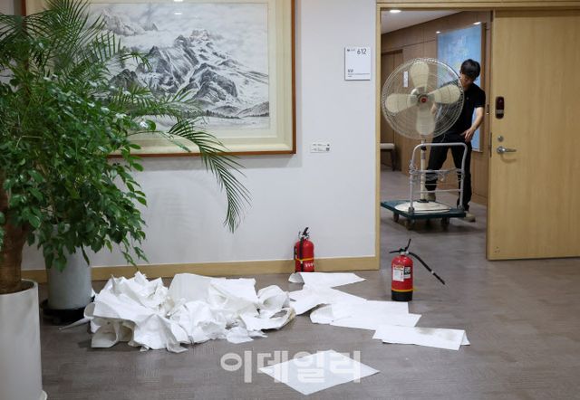 25일 고용부에 따르면 이날 오후 6시께 한 50대 남성 민원인 A씨가 세종시 노동부 청사에 침입해 김 장관 집무실이 있는 6층에서 인화물질을 뿌렸다.