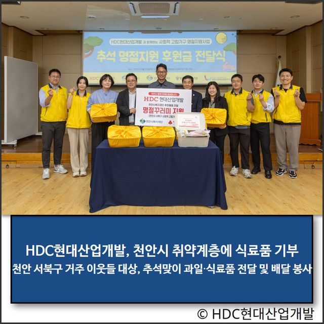 HDC현대산업개발(이하 HDC현산·294870)이 추석을 맞아 천안시 서북구 쌍용종합사회복지관에서 지역 내 취약계층을 위한 식료품 기부 행사를 열었다.