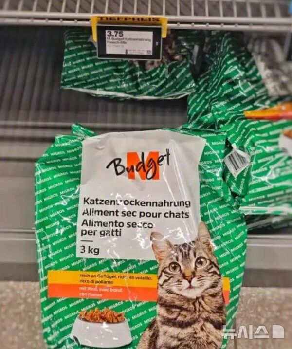 스위스 대형마트에서 판매하는 3kg짜리 고양이 사료는 단 3.75스위스프랑(약 6600원)으로 단백질 함량이 무려 32%에 달한다.