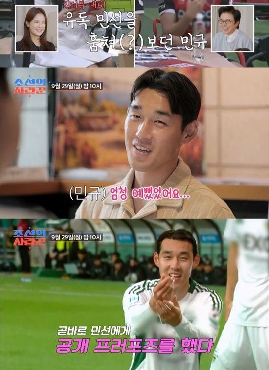 곽민선은 "그땐 금발이었다"고 첫인상이 무서웠던 이유를 전했다. VCR 속 자료 화면에서는 밝은 금발의 스포츠 커트 머리를 한 송민규가 인터뷰 내내 곽민선을 힐끔거리며 배시시 웃는 모습이 포착됐다. 송민규는 "말도 너무 잘하고 엄청 예뻤다"면서 첫 만남을 회상했다.