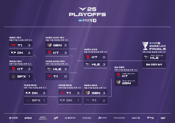 라이엇 게임즈가 개발 및 서비스하는 '리그 오브 레전드(LoL)'의 이스포츠 한국 프로 리그인 LCK를 주최하는 리그 오브 레전드 챔피언스 코리아(대표 오상헌, www.lolesports.com, 이하 'LCK')는 2025 우리은행 LCK 파이널이 오는 27일과 28일 이틀 동안 인천광역시 중구에 위치한 인스파이어 아레나에서 열리며 결승 진출전에서 kt 롤스터와 젠지가, 결승전에서는 한화생명e스포츠와 27일 승자가 맞붙는다고 밝혔다.