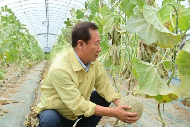 박현국 봉화군수가 출하를 앞둔 멜론을 살펴보고 있다. / 봉화군 제공