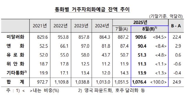 한국은행이 26일 발표한 ‘8월중 거주자외화예금 동향’에 따르면 8월 말 기준 외국환은행의 거주자 외화예금 잔액은 1076억 4000만달러로 7월 말보다 24억 9000만달러 늘었다. 이는 지난 2023년 1월 말 1092억 5000만달러를 기록한 이래 최대치다.