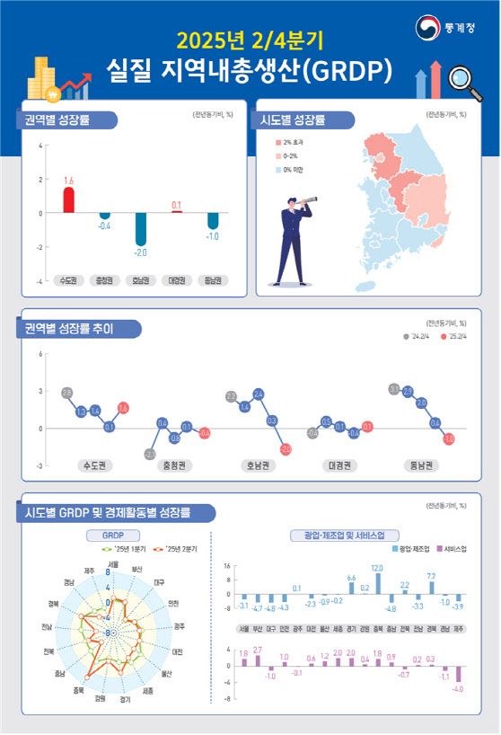 통계청이 26일 발표한 ‘2025년 2분기 GRDP’에 따르면 2분기 전국 GRDP 성장률은 0.4%로 집계됐다. 지난 1분기(0.1%) 대비 0.3%포인트 개선됐지만, 2021년 이후 역대 2번째 낮은 성장률이다. 충청권의 희비가 엇갈렸다. 충북은 5.8%를 기록하며 성장률 전국 1위를 기록했지만, 충남은 -3.9%로 전국 꼴찌다.