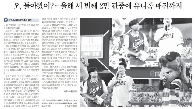 "구단 관계자는 "보통 하루 예매가 400~500장 정도라고 보면 되는데 오승환 선수의 야구장 방문 소식이 전해진 다음 날인 7일 오전 예매 확인이 1600장 이상이었다"고 했다. (중략) 삼성은 오승환의 야구장 방문에 맞춰 온·오프라인에서 유니폼 100장을 우선 판매했다. (중략) 총 판매 가격만 1000만원이 넘었다."