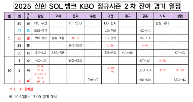 (엑스포츠뉴스 유준상 기자) 한국야구위원회(KBO)가 26일 2025 신한 SOL Bank KBO리그 정규시즌 2차 잔여 경기 일정을 확정했다.