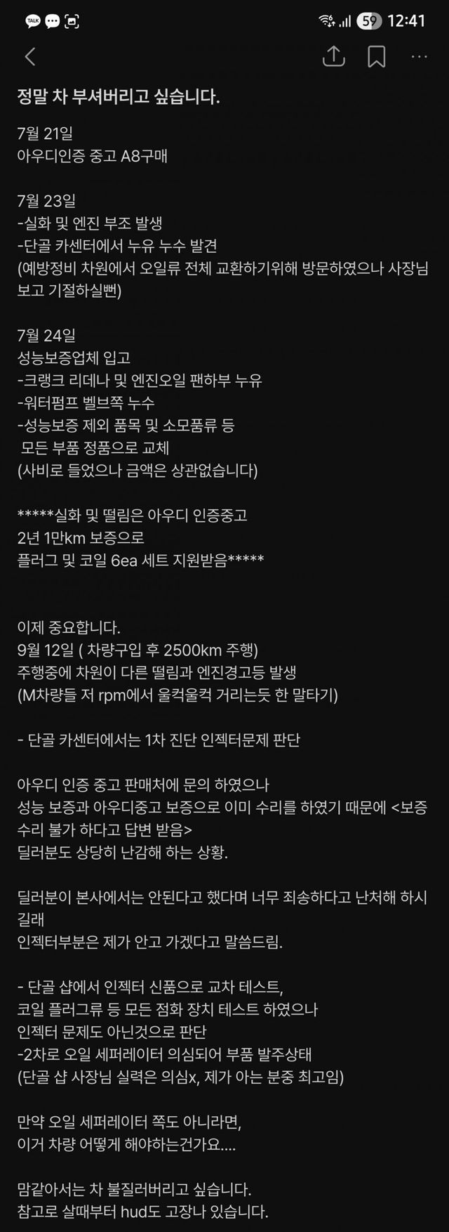 문제는 아우디 인증중고인데 아우디에서 수리안해주고