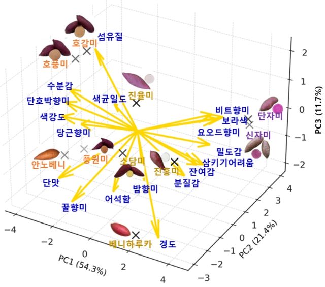 색상별 특징도 세밀하다. 밤색 고구마는 대체로 밤향미가 강하고 단호박향미와 당근향미는 약했다. 이 가운데 소담미는 꿀향미가 비교적 강했고 진율미는 경도가 가장 낮았다. 진홍미는 단맛이 약하고 분질감이 두드러졌으며 베니하루카는 단맛과 밤향미가 동시에 강했다.