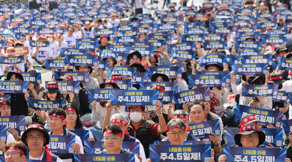 이들은 밝은 표정으로 신해철 '그대에게', 케이팝 데몬헌터스 '골든' 등 음악을 크게 튼 주최 측에 맞춰 "주 4.5일제 쟁취하자", "실질임금 인상하라"는 구호를 외치며 축제 분위기를 연출했다.