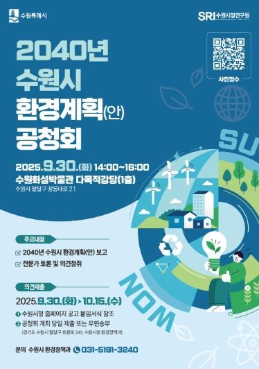 2040년 수원시 환경계획은 2026년부터 2040년까지 15년간 적용될 중장기 계획이다. 수원시정연구원이 용역을 수행하고 있다. 계획안에는 ▲환경계획의 비전과 목표 ▲세부 지표 설정 ▲공간환경계획 수립 등이 포함된다. 공청회는 계획안 발표, 전문가 토론, 의견 청취 순으로 진행된다.