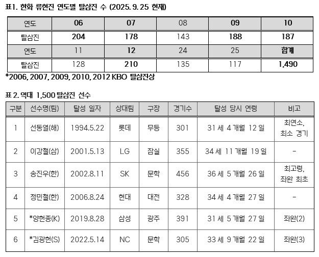 1500탈삼진은 한화 소속으로 2002시즌 송진우, 2006시즌 정민철에 이어 19년 만이며, 역대 왼손 투수로는 송진우, 양현종(KIA 타이거즈), 김광현(SSG 랜더스)에 이어 네 번째다. KBO는 류현진이 1,500탈삼진을 달성할 경우, 표창 규정에 따라 기념상을 수여할 예정이다.