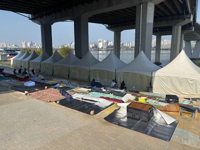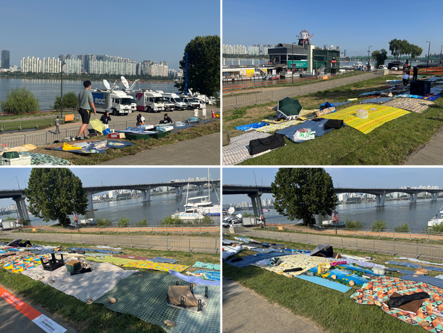 르데스크가 현장을 찾았을 때 여의도 한강공원 곳곳에는 명당 자리를 맡아주거나 하루 종일 머물며 내일을 준비하는 시민들이 적지 않았다. 이들은 돗자리를 깔아두고, 바람에 날리지 않도록 보도블록이나 캐리어, 무거운 가방으로 눌러뒀다. 장시간 머물러야 하는 만큼 접이식 의자와 간이 책상까지 갖춘 모습도 보였다.