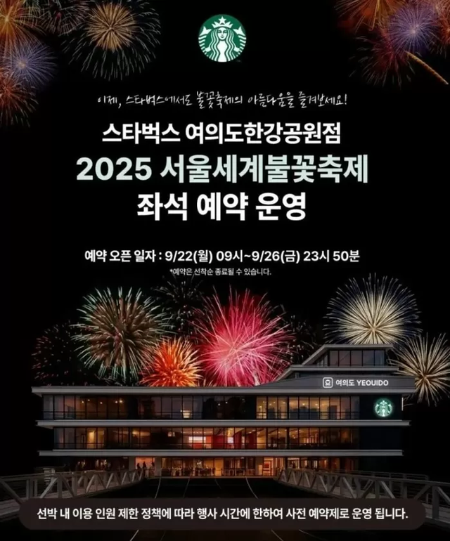 여의도 한강공원 바로 앞에 있는 스타벅스도 세계불꽃축제 기간에는 선박 내에 손님들이 몰릴 경우 안전에 문제가 있을 수 있다며 좌석을 유료로 판매하기로 결정했다. 지난 23일 2인 좌석을 10만~20만원에 판매했으며 판매 개시와 동시에 전 좌석 매진 됐다. 이 역시 중고거래사이트에 10만원 웃돈을 붙여 리셀(되팔기)한다는 게시물도 쉽게 볼 수 있었다.