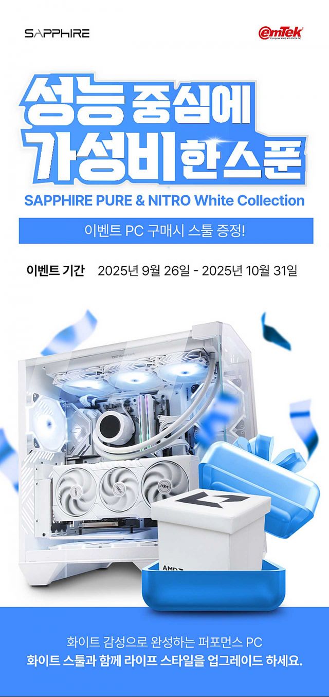"이엠텍이 9월 26일부터 10월 31일까지 SAPPHIRE 퓨어 & 니트로 화이트 콜렉션 PC 기획전을 연다. RX 9060XT부터 RX 9070XT PURE, NITRO+ 라인업까지 다양한 구성이 마련돼 초보자부터 하드코어 게이머까지 만족할 수 있으며, 행사 기간 구매 고객 전원에게는 AMD X SAPPHIRE 한정 게이밍 스툴과 리뷰 이벤트 참여 시 네이버페이 1만5천 원이 제공된다."